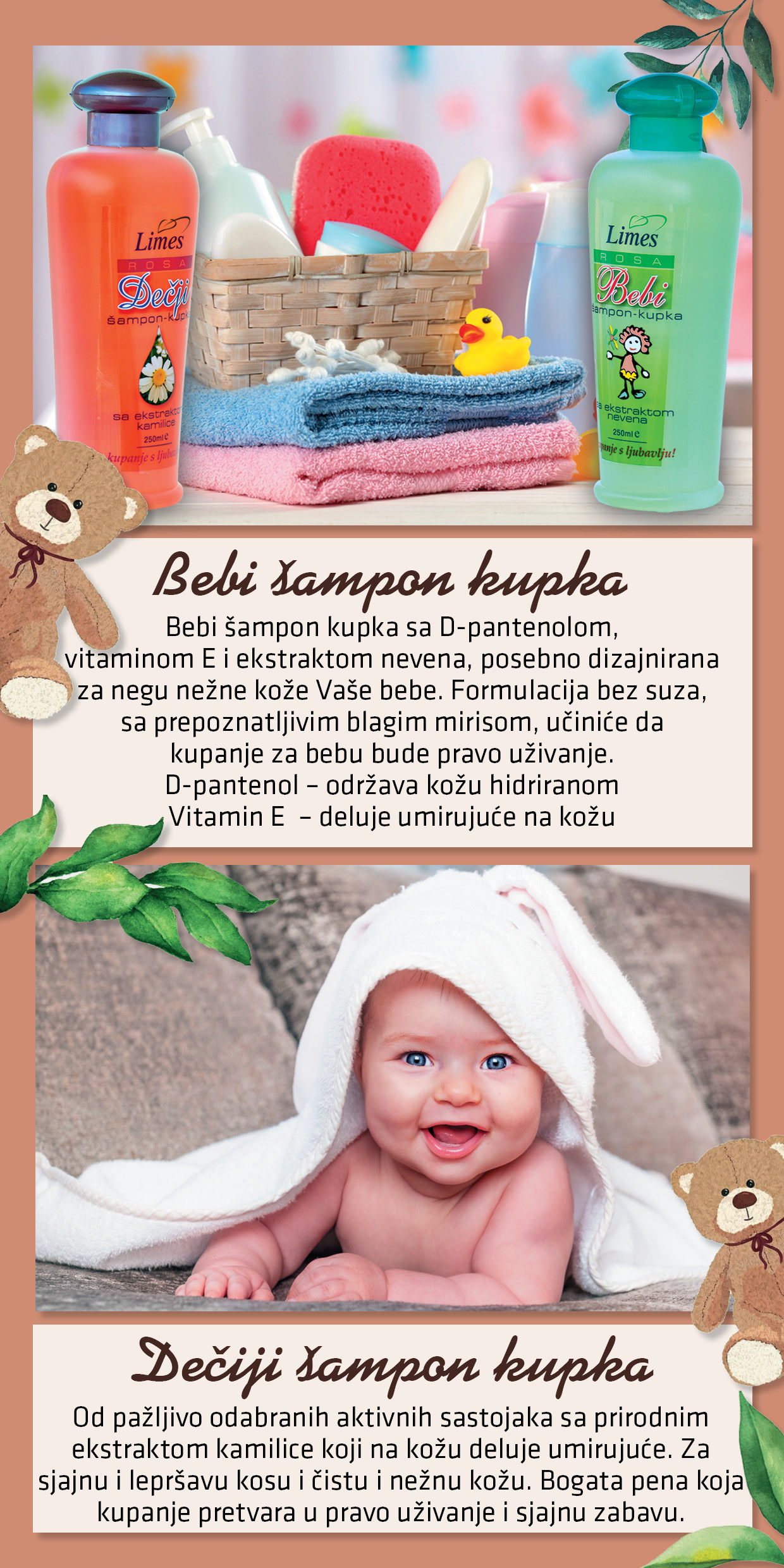 ŠIFRA: 9114 Karakteristike: Sadrži ekstrakt nevena, kamilice, tokoferola, provitamin B, D-Panthenol. Dejstvo: Ekstrakta nevena(Calendula Officinalis) omekšava kožu i podstiče cirkulaciju krvi. Neven hrani i regeneriše kožu. Kamilica (Chamomilla Matricaria) deluje protivupalno i antibakterijski na kožu. Kupka je formulisana na bazi blagih i visoko kvalitetnih aktivnih materija. Neutralna je i bezbedna čak i za najosetljiviju dečju kožu. Njeno blago dejstvo garantuje ekstrakt nevena, tokoferola i provitamina B. Kupka stvara bogatu penu koja se lako ispira i ne iritira oči te kupanje za bebu postaje uživanje. Koristi se za pranje i negu kože i kose.
